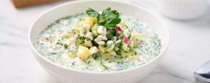 Окрошка с куриной грудкой — прохладный летний суп с нежным вкусом и овощами. Идеален для обеда или ужина.