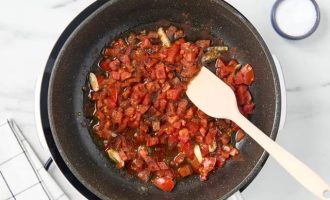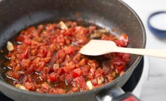 • Нагрейте сковороду с маслом до средней температуры. Положите в неё помидоры и чеснок.