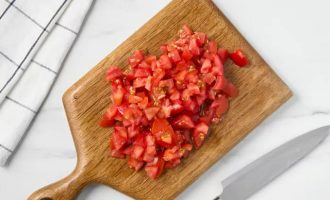 • Для того чтобы быстро снять кожицу с помидоров, сделайте на них надрезы в виде креста, после чего обдайте их кипятком. Затем нарежьте помидоры мелкими кубиками.