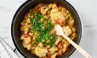 • Мелко нарежьте петрушку и зелёный лук. В конце приготовления добавьте их в рагу из цветной капусты и тщательно перемешайте.