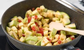 • Отправьте кабачок на сковороду. Аккуратно перемешайте. Затем накройте овощи крышкой и готовьте на медленном огне 3-5 минут.