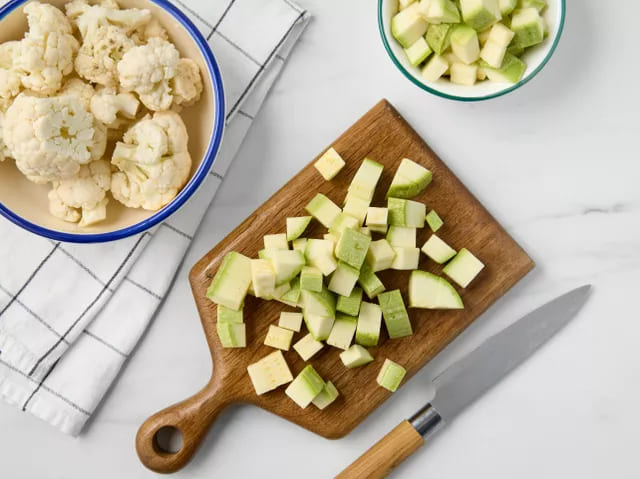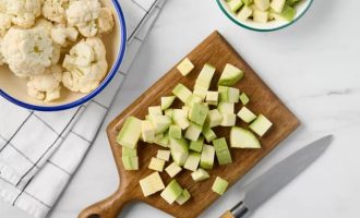 • Нарежьте кабачок на кубики среднего размера. Цветную капусту разделите на небольшие соцветия.