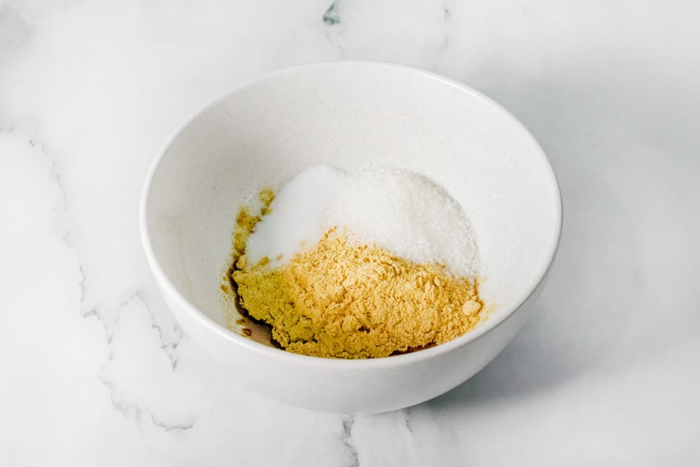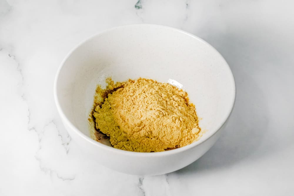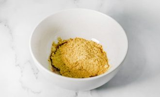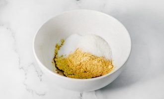 Сначала в миску для смешивания нужно налить растительное масло, а затем добавить сухой горчичный порошок.