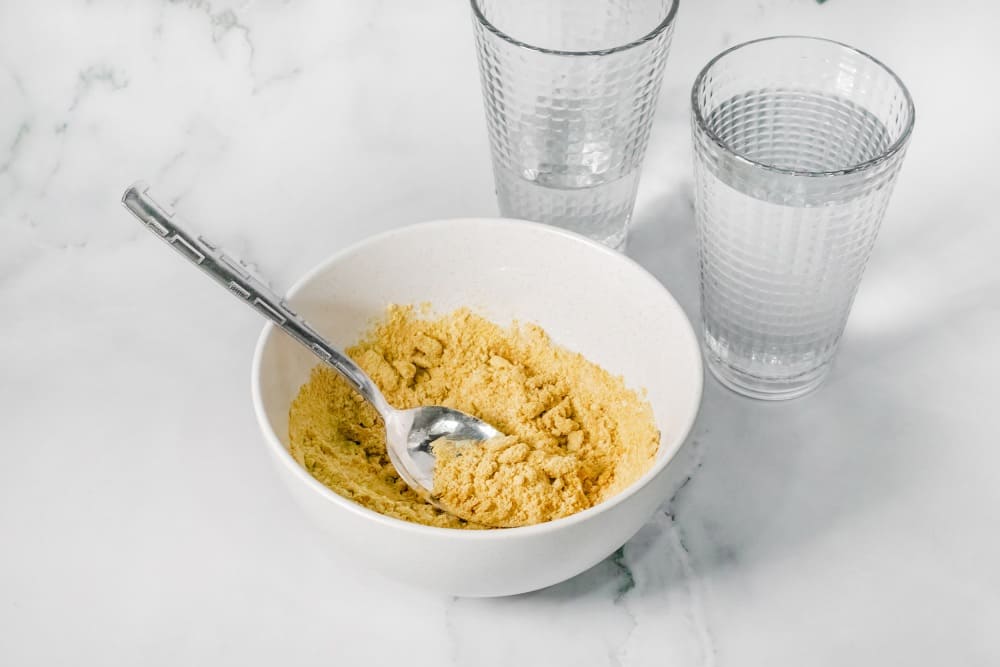 Добавляйте воду в смесь постепенно, тщательно перемешивая. Горчица увеличивается в объёме, поэтому начните с малого количества воды и добавляйте её при необходимости, чтобы избежать излишней жидкости и сохранить пропорции.