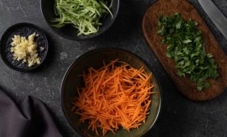 Морковь следует натереть на терке для приготовления моркови по-корейски. Чеснок нужно пропустить через пресс. Огурец также измельчите на этой терке. Листья кинзы крупно нарежьте.