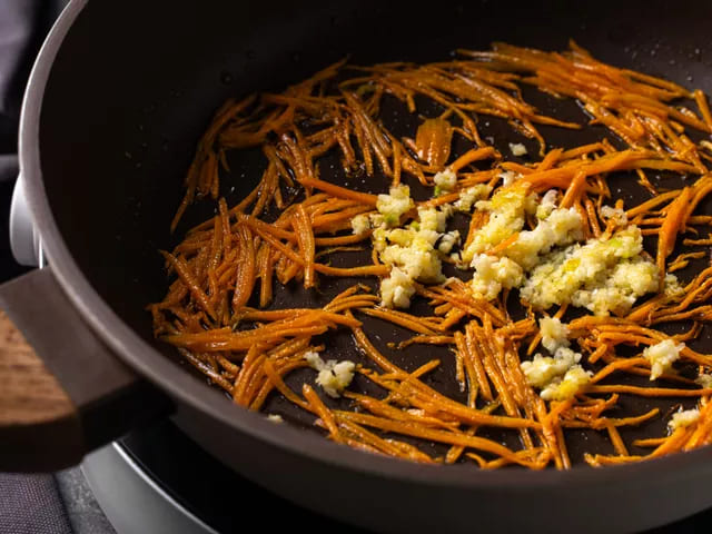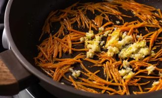 Налейте растительное масло в сковороду и разогрейте его на среднем огне. Помешивая, обжарьте морковь до мягкости, это займет примерно 3–4 минуты. Затем добавьте чеснок и прогревайте еще минуту.
