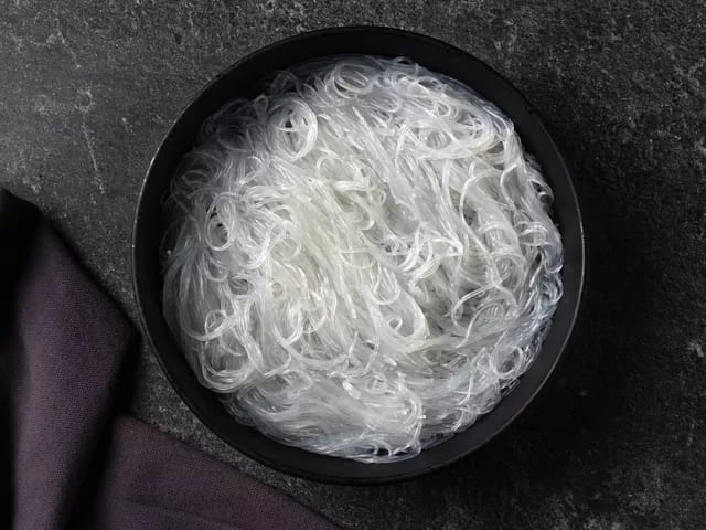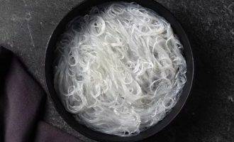 Поместите фунчозу в термостойкую посуду. Вскипятите в чайнике 1,5–2 стакана воды и залейте ею лапшу. Накройте ёмкость крышкой, оставьте на 5 минут, затем слейте воду.