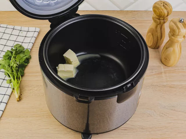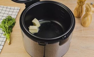 Установите режим «Жарка» на мультиварке и растопите сливочное масло.