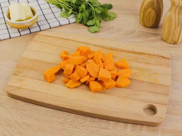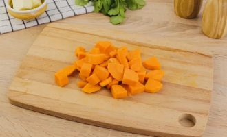 Лук-порей нашинкуйте полукольцами. Морковь нарежьте крупными кубиками. Говядину разделите на средние кусочки. Кинзу мелко нарежьте.
