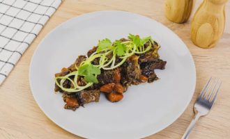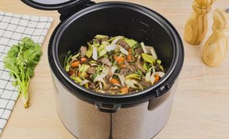Обжарьте говядину на протяжении 5-7 минут. Затем положите лук-порей и морковь. Всыпьте соевый соус и воду. Положите кинзу. Тщательно всё перемешайте.