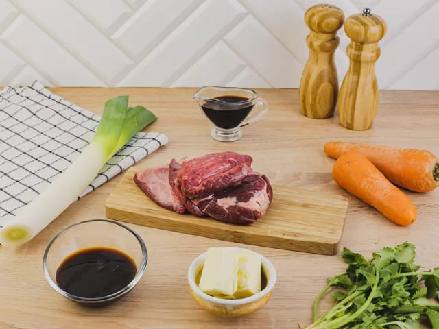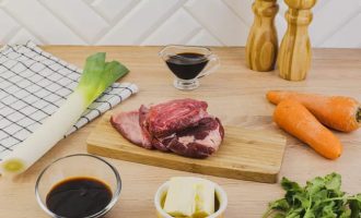 Удалите из говядины жилы и пленки. Промойте мясо холодной водой и обсушите его бумажным полотенцем. Очистите морковь и помойте лук-порей.