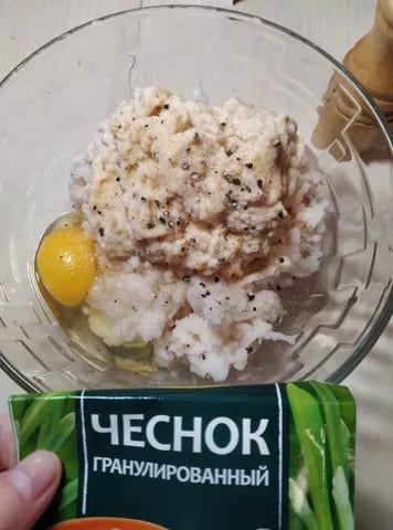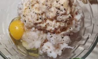 Измельчите повторно рыбу с белым хлебом и лук с помощью мясорубки или блендера. Введите в получившуюся массу яйцо, соль, перец и сушеный чеснок. Тщательно перемешайте и отбейте.