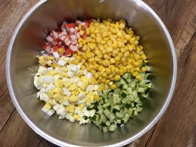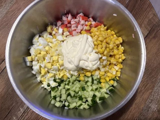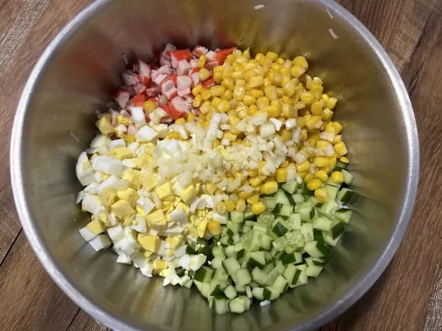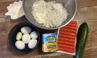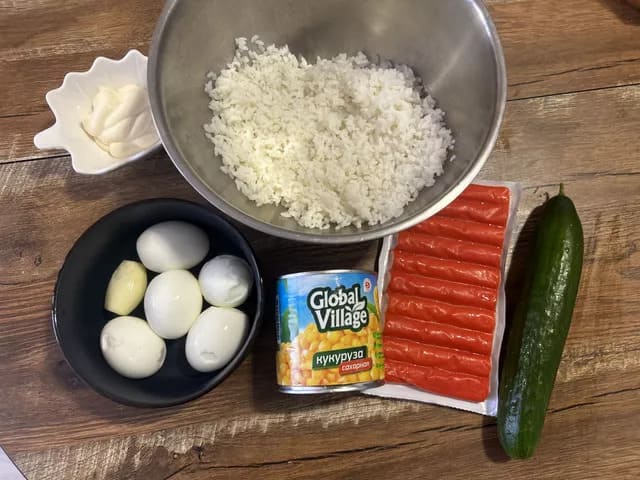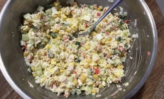 Салат крабовый с рисом сытный, его можно приготовить много без лишних затрат.
