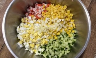 Слейте воду из кукурузы. Положите кукурузу в миску вместе с остальными продуктами.