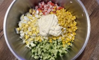 Посолите по вкусу и тщательно всё перемешайте. Перед подачей дайте салату настояться не менее часа.
