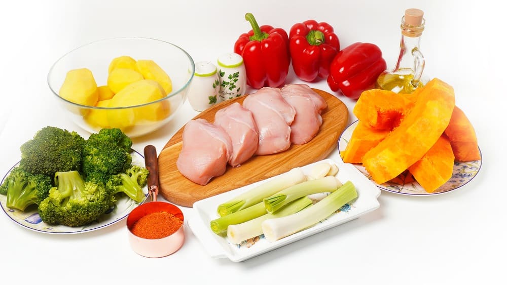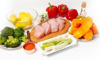 Подготовьте все ингредиенты для приготовления курицы с овощами по-деревенски. Овощи нужно тщательно вымыть и очистить. Из сладкого перца следует удалить плодоножку и сердцевину.