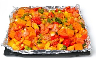 Перемешайте тщательно и разложите на противне, который предварительно застелите плотной фольгой. Если хотите, можно подогнуть края фольги, чтобы овощи не выпадали. Также подойдёт более глубокий противень.