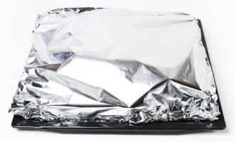 Накройте вторым листом фольги, прижмите по краям и скрепите углы, сделав конверт. Запечатайте так, чтобы лист можно было снять для перемешивания. Запекайте в разогретой до 220-230 градусов духовке 40 минут.