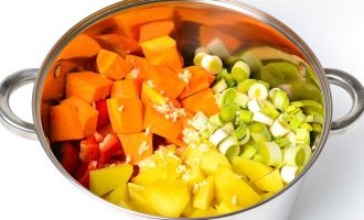 Поместите все овощи в большую кастрюлю (у меня она на 8 литров). Затем выдавите в неё 3-4 зубчика чеснока.