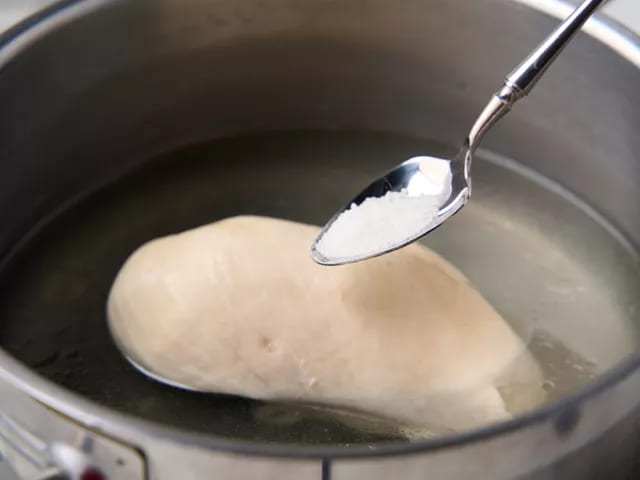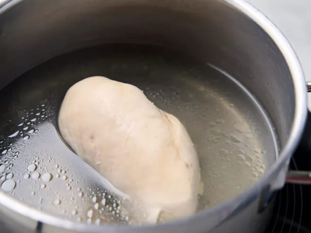 Добавьте в воду ¼ чайной ложки соли. Варите грудку примерно 20-25 минут. После варки дайте грудке остыть, затем аккуратно отделите филе от кожи и костей.
