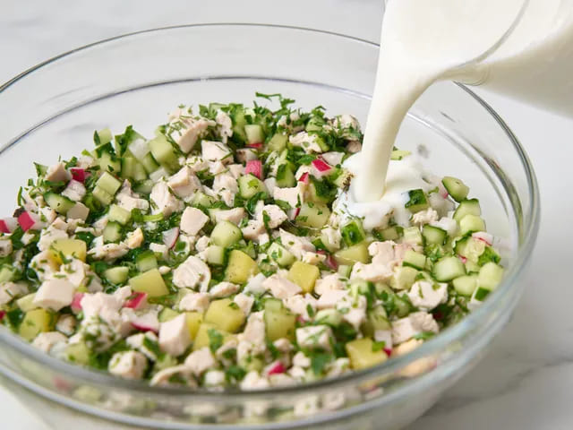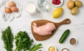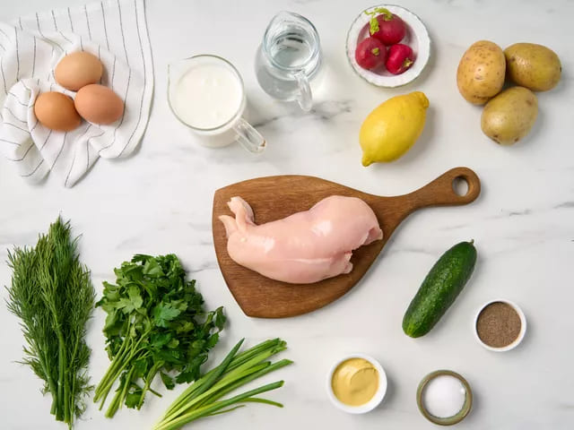 Окрошка с куриной грудкой — прохладный летний суп с нежным вкусом и овощами. Идеален для обеда или ужина.