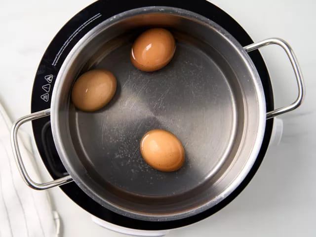 Выложите яйца кастрюлю и залейте их водой. Доведите воду до кипения и готовьте яйца вкрутую на протяжении 8-9 минут. После этого остудите их в ледяной воде и аккуратно удалите скорлупу.