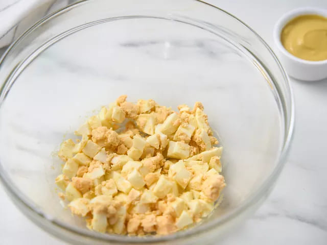 Нарежьте яйца кубиками небольшого размера и поместите их в глубокую миску. Затем добавьте горчицу и хорошо перемешайте.