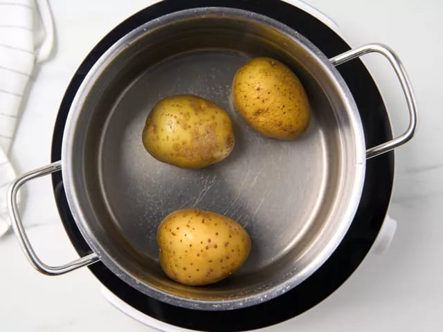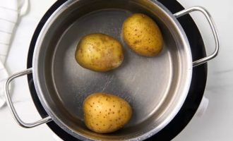 Положите картофель в кастрюлю, залейте водой почти до верха и поставьте на сильный огонь. Когда закипит, уменьшите огонь до среднего и варите 25-30 минут. Остудите и снимите кожуру.
