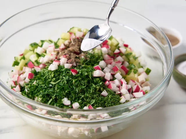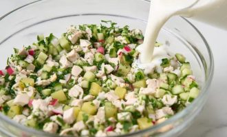 К яйцам добавьте измельчённые картофель, курицу, огурцы, редис и зелень. Возьмите ¼ часть лимона, выдавите из неё сок в миску с подготовленными ингредиентами. Всыпьте ¼ чайной ложки соли и чёрный перец, тщательно перемешайте.