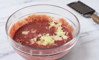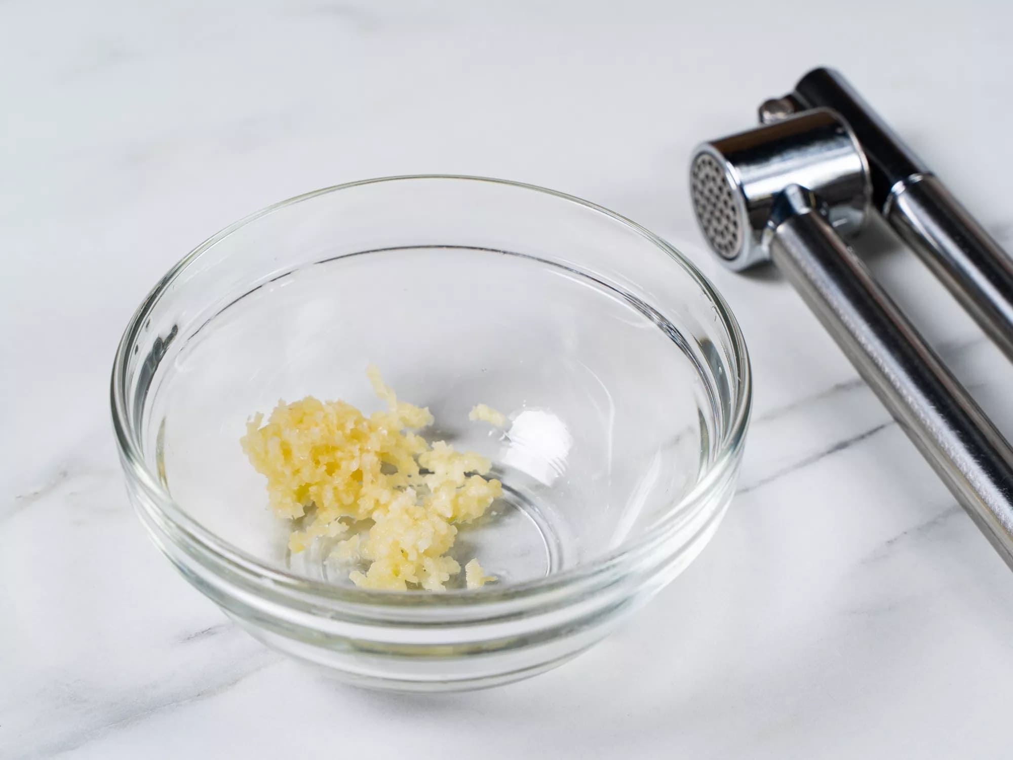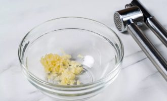 Раздавите чеснок с помощью специального устройства (пресса). Положите его в маленькую тарелку.