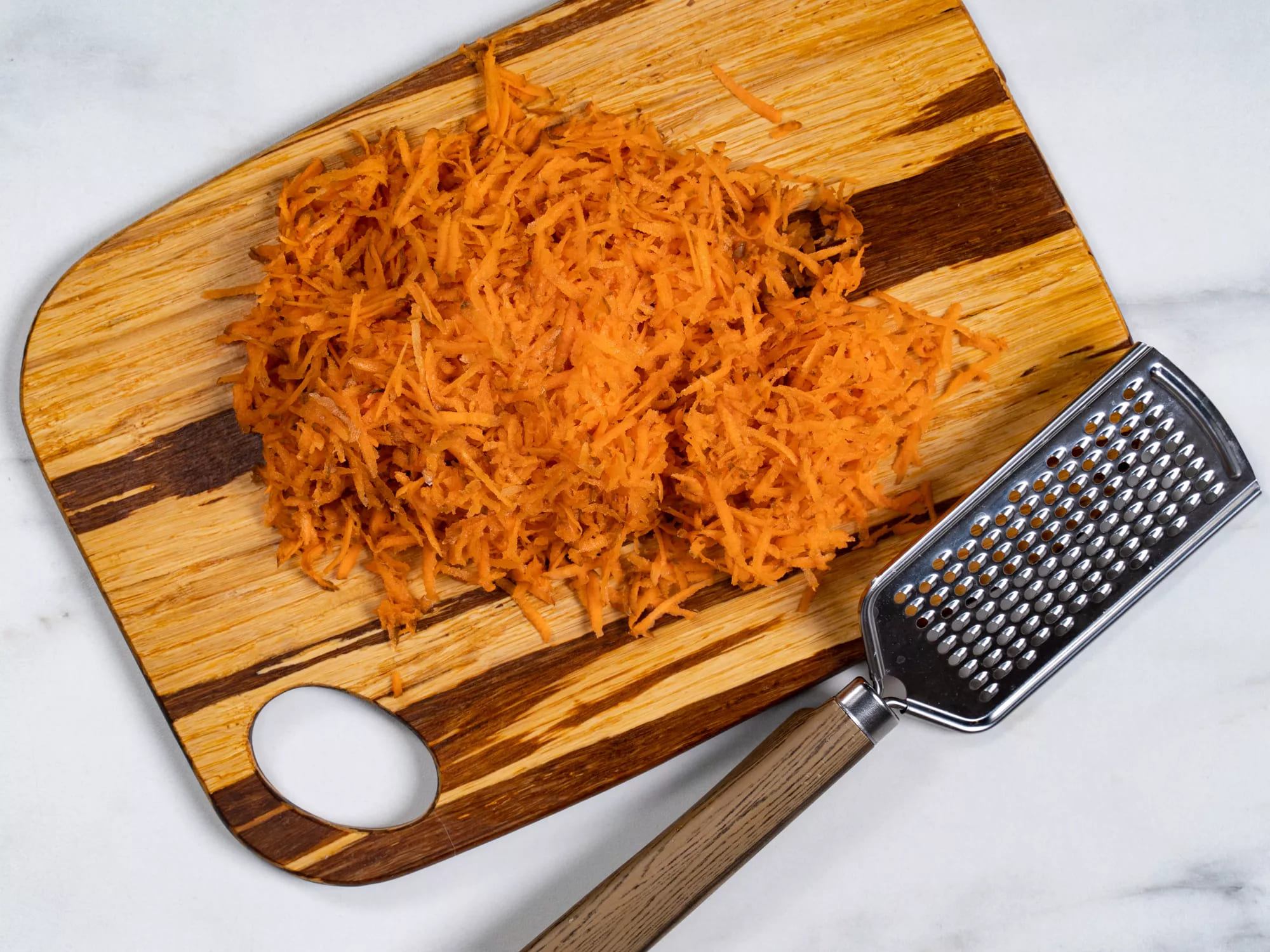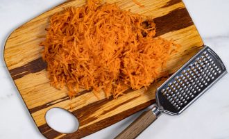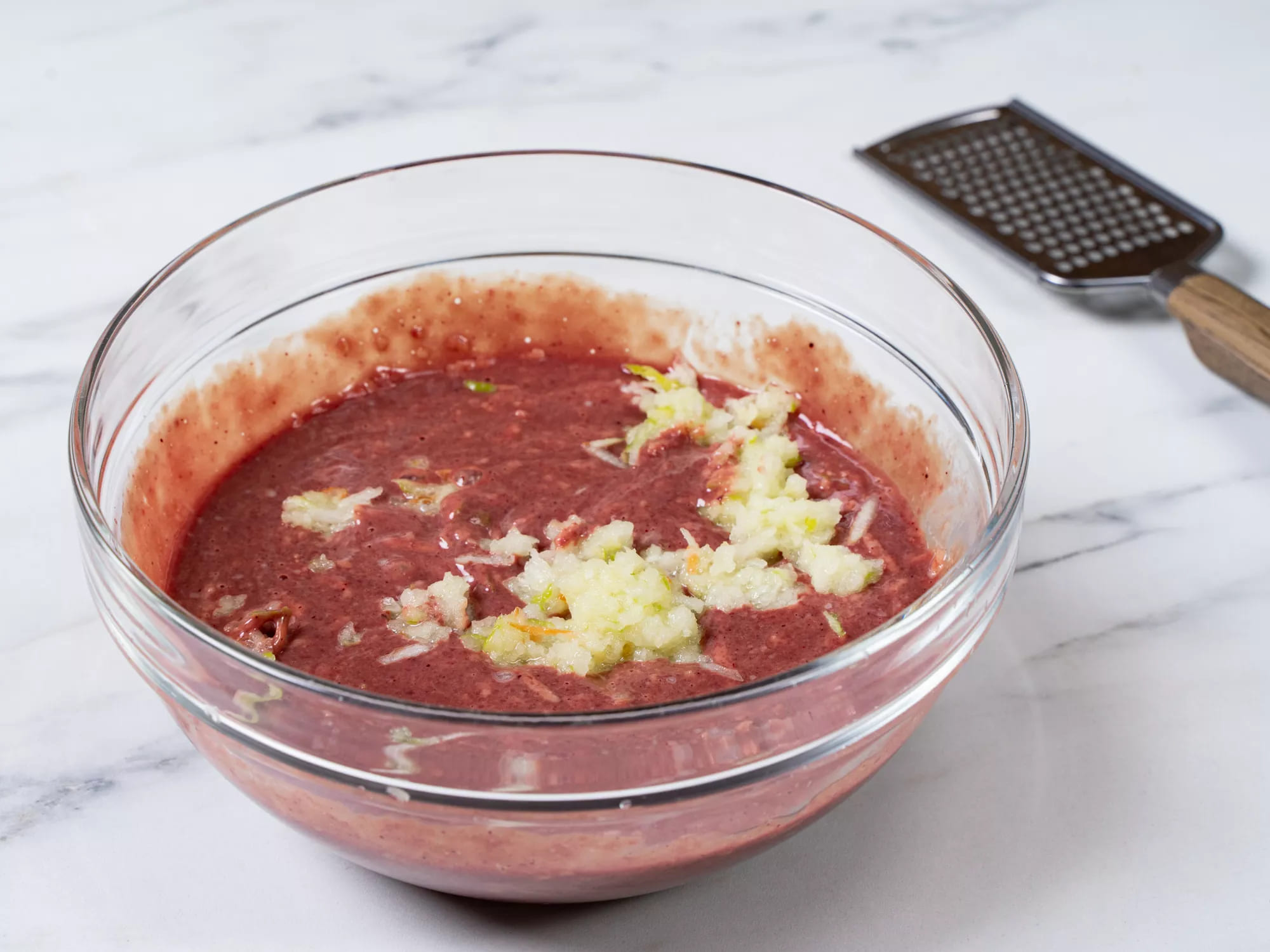 Натрите яблоко на терке, выбирая размер — средний или мелкий. После этого добавьте его к печеночному фаршу.