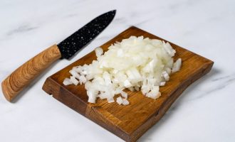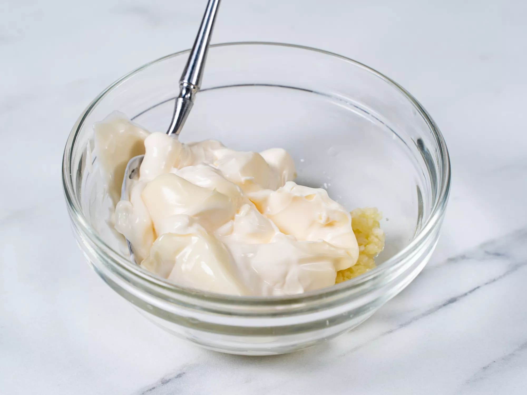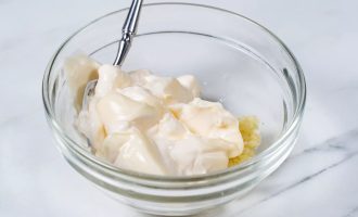 Возьмите чеснок и добавьте к нему майонез. Хорошо перемешайте.