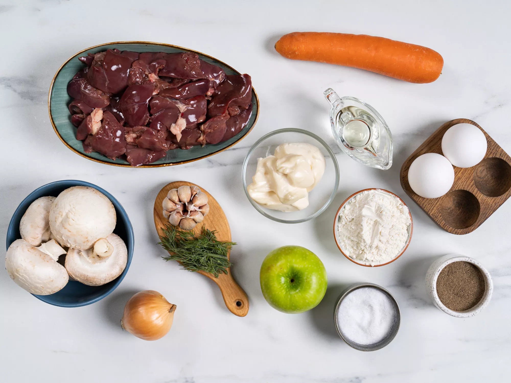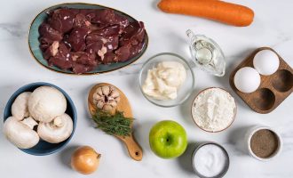 Для приготовления печеночного торта нам нужно следующее. Куриную печень тщательно промойте, удалите пленки и сгустки крови. Затем обсушите её с помощью бумажных полотенец. Лук, чеснок, морковь, шампиньоны, яйца, укроп и яблоко также промойте. После этого грибы, яйца и укроп необходимо обсушить. Овощи и яблоко очистите.