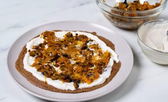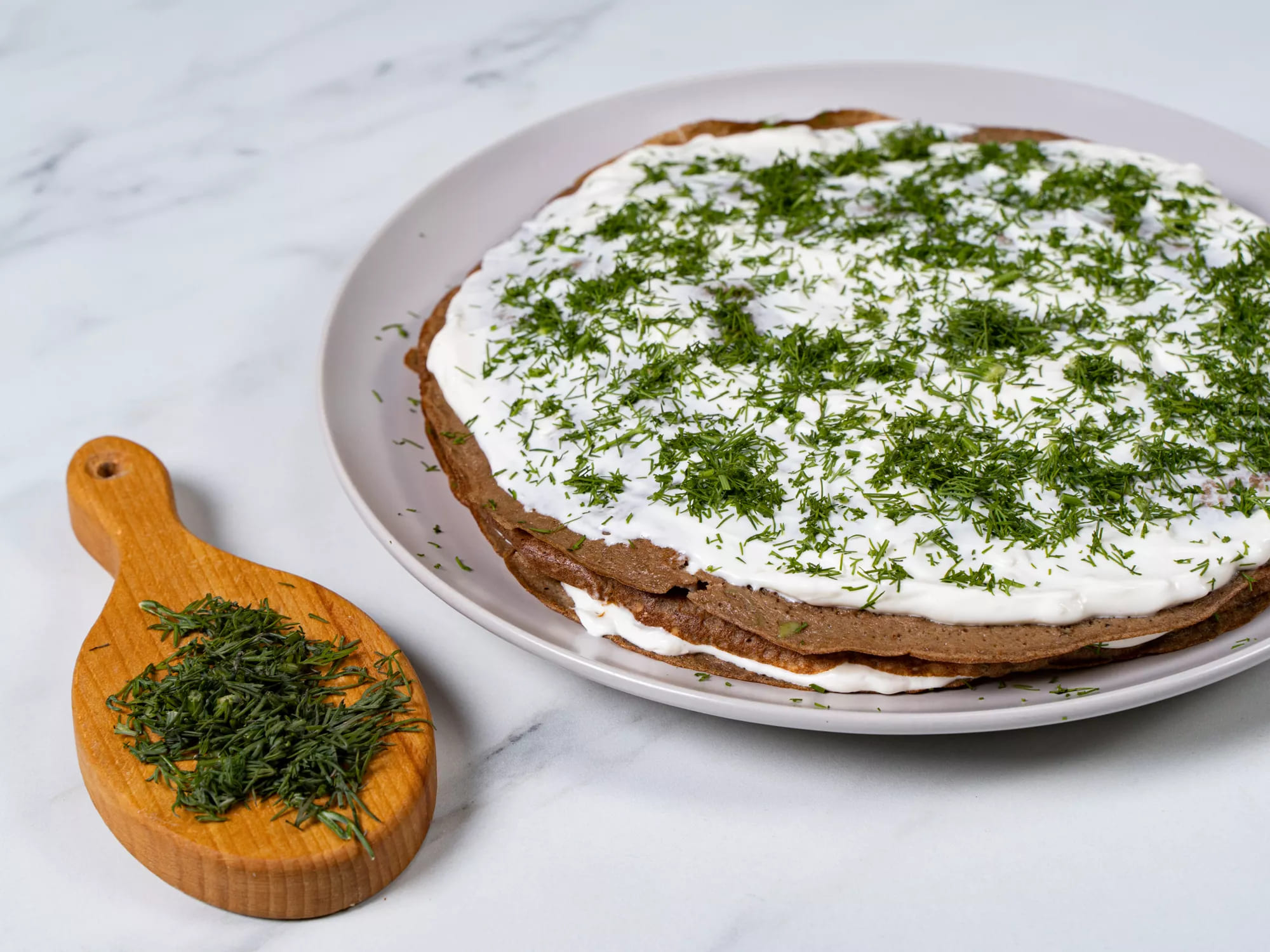 Возьмите немного начинки и намажьте её на соус. Положите наверх второй блин. Снова намажьте его майонезом и добавьте немного начинки. Повторите это со всеми оставшимися блинами. На верхний блин нанесите только майонез с чесноком, начинку не кладите.