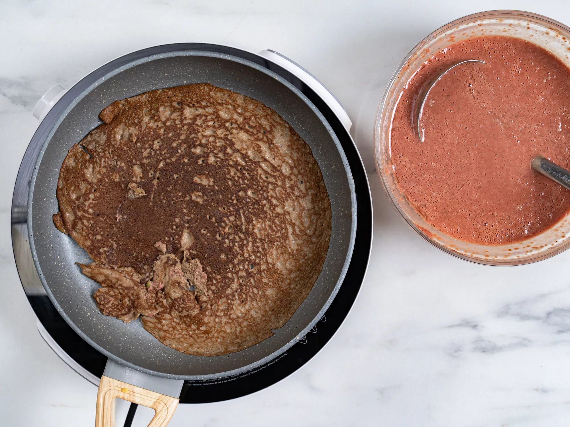 Влейте в сковороду две столовые ложки масла и разогрейте его. Используя половник, аккуратно налейте немного теста на сковороду. Обжаривайте блинчик с каждой стороны по две минуты, затем переложите на тарелку. Повторите этот процесс с оставшимся тестом.