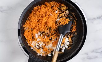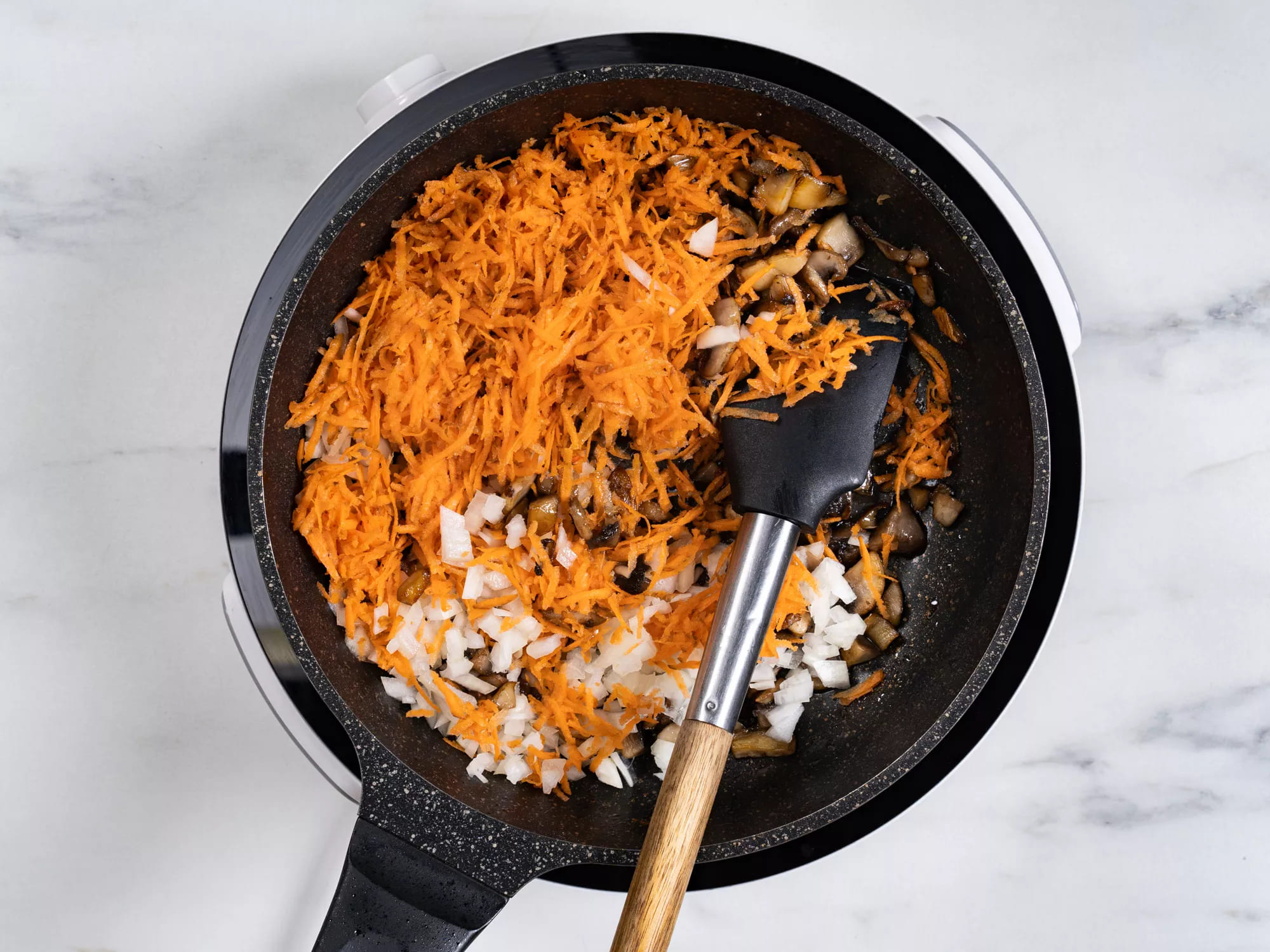 Положите лук и морковь в сковородку к грибам. Жарьте всё вместе ещё 7 минут. Потом выключите огонь и дайте начинке остыть.