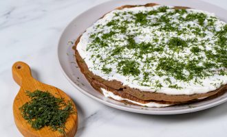 Мелко нарежьте укроп. Посыпьте им верхний слой торта. Уберите торт в холодильник минимум на 1 час.