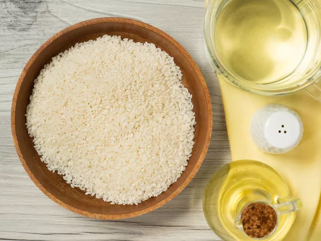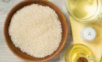 В сотейник или кастрюлю насыпьте рис и залейте его водой в пропорции 1:2. Влейте растительное масло, добавьте соль и тщательно перемешайте рис.