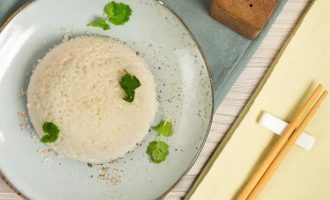 Рис можно подать, выложив его в чашку или пиалу, а затем перевернув на тарелку, чтобы он принял форму куличика. Также можно добавить украшение в виде веточки свежей петрушки.