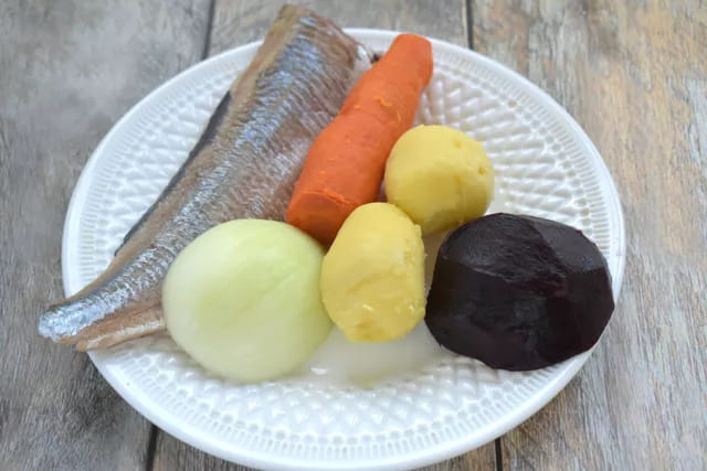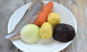 Подготовьте картофель, морковь и свеклу: отварите в мундире или запеките при 200°C 1 час, затем остудите и очистите. Разделайте селедку на филе и очистите лук.