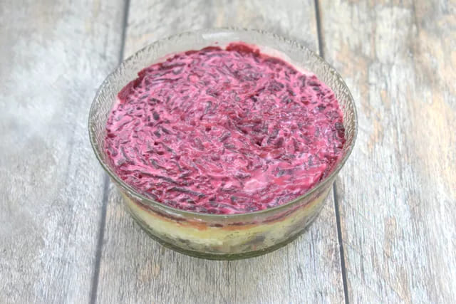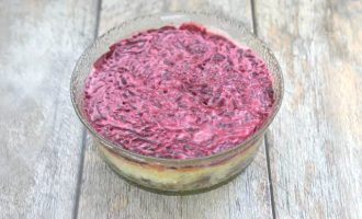 Финальный слой салата — натертая свекла. Покройте свекольный слой майонезом. Поставьте салат в холодильник минимум на час, чтобы слои пропитались. Подавайте салат к столу, украсив по своему вкусу.