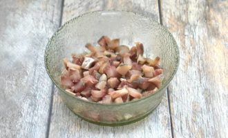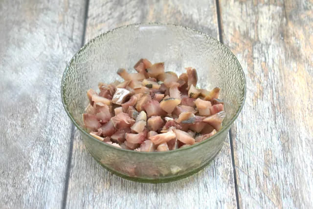 На первый слой салата выложите нарезанную мелкими кубиками сельдь.