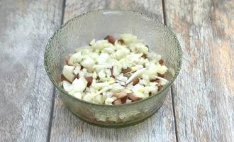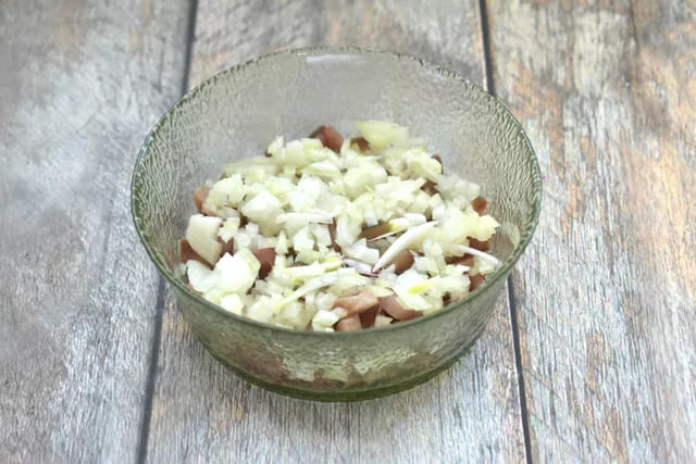 Лук нарежьте мелкими кубиками. Затем выложите его следующим слоем и смажьте майонезом.