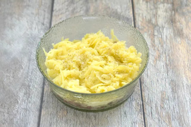На луковый слой выложите натёртый картофель. Посолите и поперчите картофельный слой, затем смажьте его майонезом.