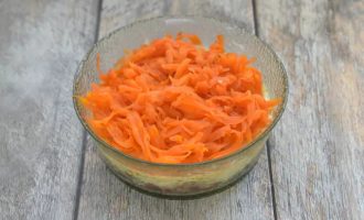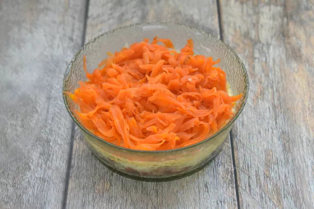 Далее идет слой моркови. Натрите её, выложите на картофельную основу и покройте майонезом.