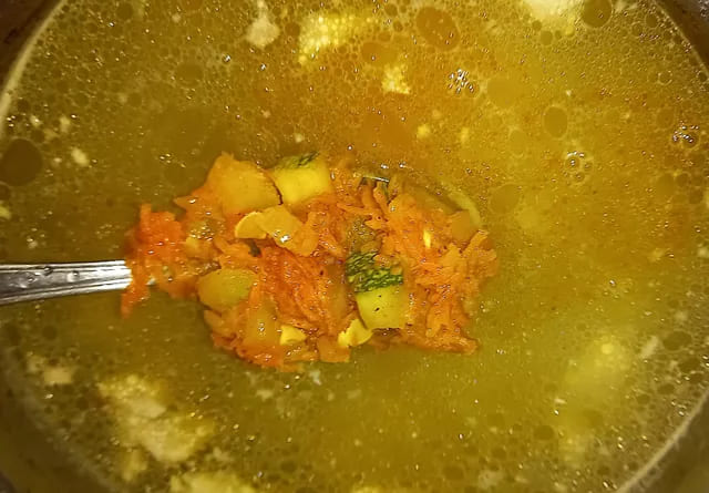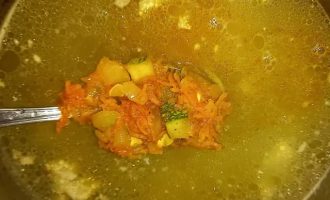 После того как картофель будет готов, добавьте в суп обжаренные овощи.