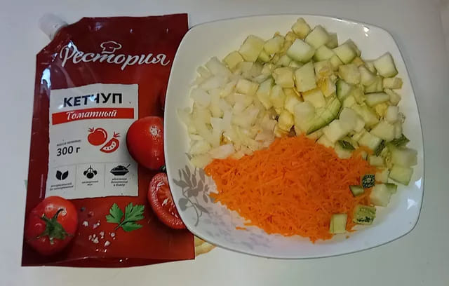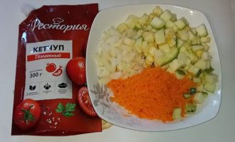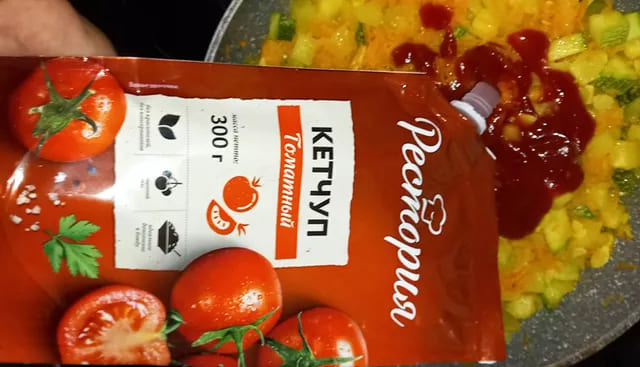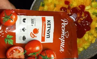 Обжарьте овощи на сковороде, добавив немного оливкового масла. После этого влейте кетчуп и продолжайте готовить на среднем огне в течение 5-10 минут.