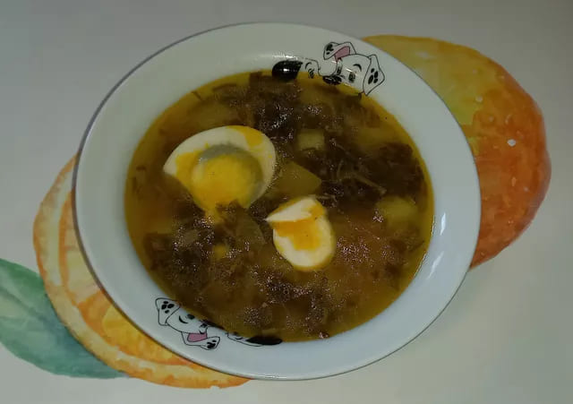 Суп рекомендуется подавать с куриным яйцом и сметаной.