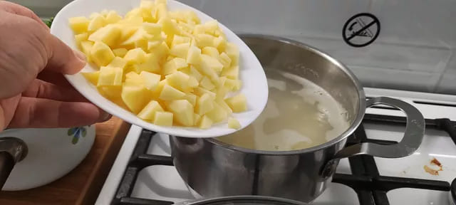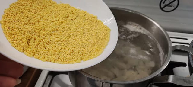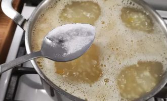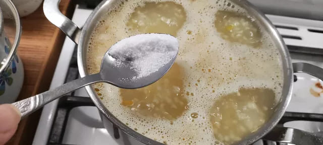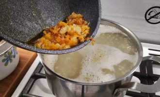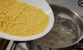 Когда бульон закипит, в кастрюлю следует всыпать пшено.